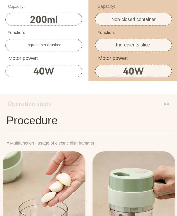 【Chop Food Safely】Electric mini chopper comfortable to hold, breaking the dangling click mode of the traditional veggie chopper, the ergonomic design does not tire your hands, the vegetable chopper protects your fingers from the blades when slicing and you no longer need any slicer skills to cut your vegetables.